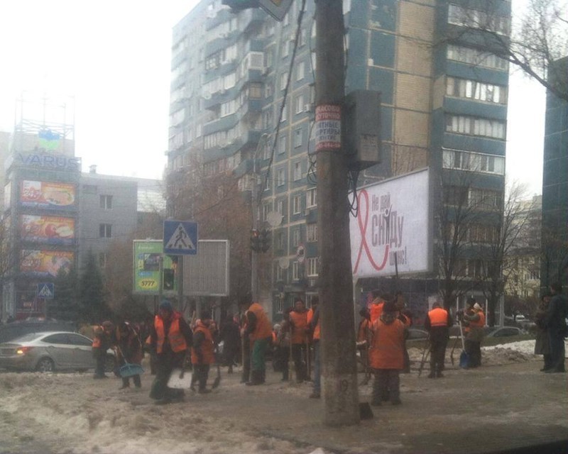 - Скажите, а когда вы видели столько коммунальщиков в одном месте, которые дружно долбят лёд на тротуаре и бросают снег с обочин на дорогу? - задается вопросом местный журналист и блогер Вячеслав Поездник. - Президента ждём, да? А травку зелёную будут на газонах вкапывать по пути проезда кортежа президента, не знаете?