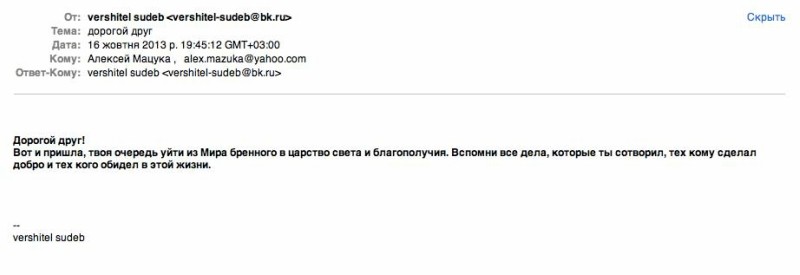 Редактор интернет-издания "Новости Донбасса" Алексей Мацука получил письмо: Ранее журналисты "НД" замечали слежку и в их офис ломились неизвестные . Алексей просил ментов предоставить ему охрану, но не получил ответа.